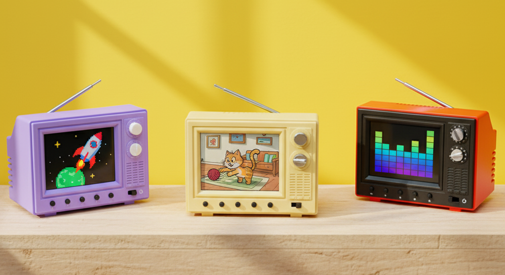 Whether you’re vibing with bold purple, classic red, or cozy cream yellow — each TV has its own unique charm. Choose the color that fits your space, your style, or your favorite cartoon universe. More colors coming soon!